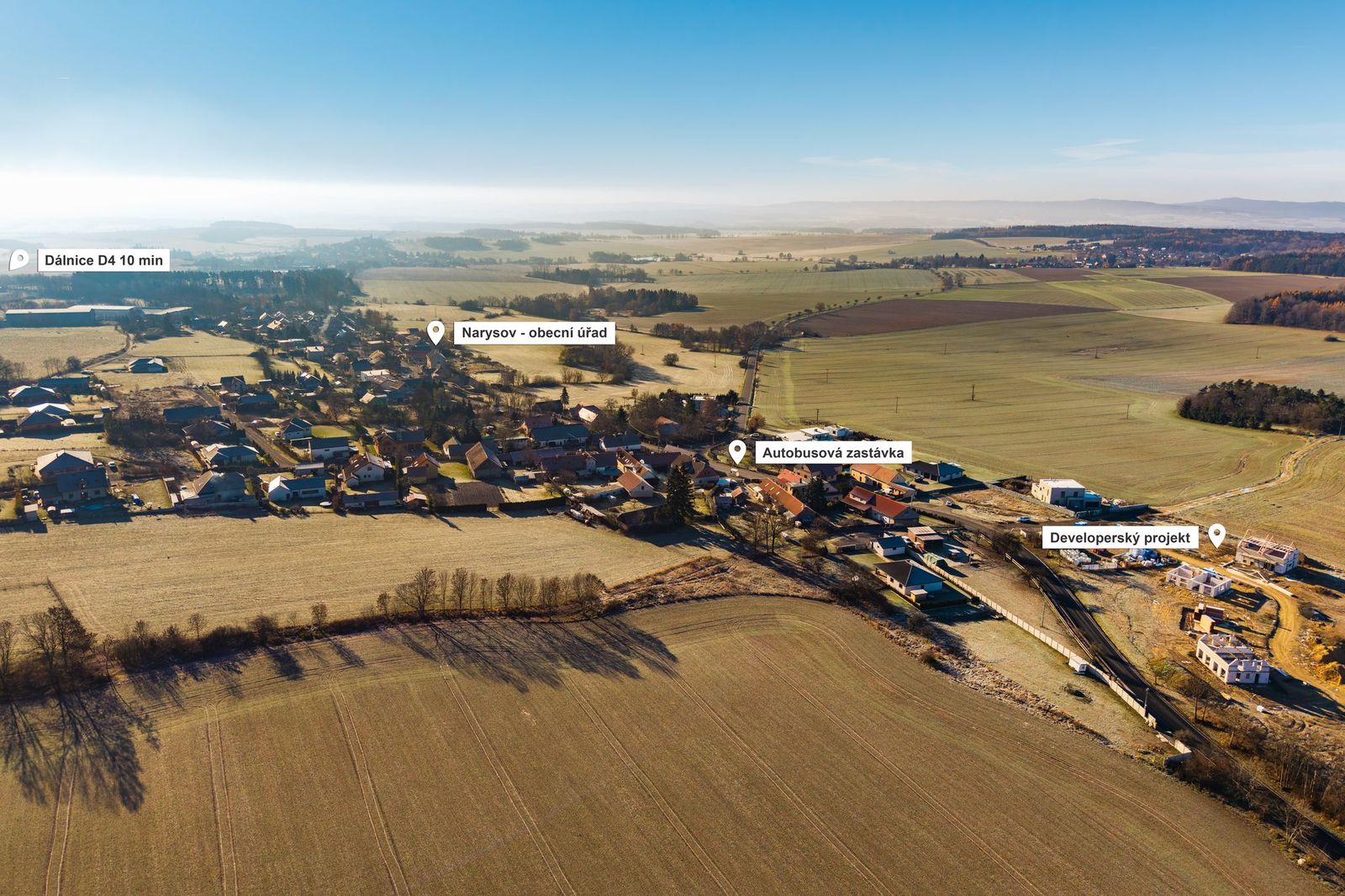Zelená Narysov nabízí ideální rovnováhu mezi klidem venkova a komfortem městského života. Jen pár minut od domova máte k dispozici veškerou občanskou vybavenost v Příbrami – školy, školky, obchody i služby. Zároveň jste obklopeni přírodou, která vybízí k procházkám, běhání nebo cyklistice. V okolí najdete louky, pole, lesní cesty a rybníky, kam můžete vyrazit s dětmi nebo se psem. A večer? Zpátky do ticha. Bez aut, bez ruchu, jen s výhledem na oblohu.